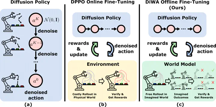 Fine-tuning diffusion policies with reinforcement learning (RL) presents significant challenges. The long denoising sequence for each action prediction impedes effective reward propagation. Moreover, standard RL methods require millions of real-world interactions, posing a major bottleneck for practical fine-tuning. Although prior work frames the denoising process in diffusion policies as a Markov Decision Process to enable RL-based updates, its strong dependence on environment interaction remains highly inefficient. To bridge this gap, we introduce DiWA, a novel framework that leverages a world model for fine-tuning diffusion-based robotic skills entirely offline with reinforcement learning. Unlike model-free approaches that require millions of environment interactions to fine-tune a repertoire of robot skills, DiWA achieves effective adaptation using a world model trained once on a few hundred thousand offline play interactions. This results in dramatically improved sample efficiency, making the approach significantly more practical and safer for real-world robot learning. On the challenging CALVIN benchmark, DiWA improves performance across eight tasks using only offline adaptation, while requiring orders of magnitude fewer physical interactions than model-free baselines. To our knowledge, this is the first demonstration of fine-tuning diffusion policies for real-world robotic skills using an offline world model. We make the code publicly available at https://diwa.cs.uni-freiburg.de.